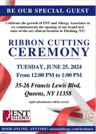 ENT and Allergy Associates, LLP (ENTA) would like to invite you to a ribbon-cutting ceremony for its brand new state-of-the-art clinical location on Tuesday, June 25th from 12-1PM at 35-26 Francis Lewis Blvd, Ground Fl, Flushing, NY 11358.