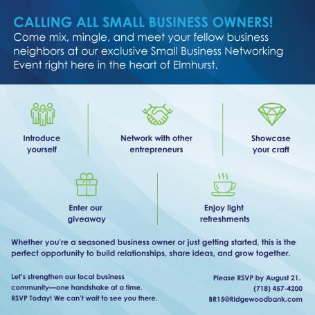 Please RSVP at (718) 457-4200 or email BR15@ridgewoodbank by August 21 to secure your spot today!