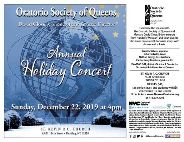 The Oratorio Society of Queens will perform its Holiday 2019 Concert on Sunday, December 22, 2019 at 4:00 p.m.