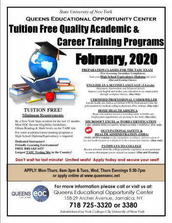 The SUNY Queens Educational Opportunity Center continues to offer tuition free quality academic and career training programs.